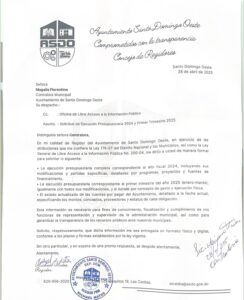 Además, solicitó formalmente ante la Contraloría Municipal y la Oficina de Libre Acceso a la Información Pública la ejecución presupuestaria completa del año 2024 y del primer trimestre de 2025, incluyendo todos los adendos y modificaciones, así como el listado actualizado de cuentas por pagar del Ayuntamiento.